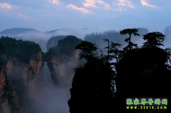 在“后花園”的對(duì)面,是一座巍峨的山巒,山上古木參天,遮天蔽日。森林中常有野山羊出沒(méi),夜深人靜之際,常能聽(tīng)到野羊羔“咩洋”地叫聲,因此被稱(chēng)作“羊寨”。民國(guó)時(shí)期,此地曾為土匪占領(lǐng),直到現(xiàn)地,山上還殘留有卡門(mén)、暗堡、斷壕、屋場(chǎng)、水井、碓臼、磨坊等殘跡。粗大的松樹(shù)上還留有土匪當(dāng)年留下的“V”字型標(biāo)志。站在“山寨”上,舉目眺望,可看見(jiàn)金鞭溪全景,只見(jiàn)一條美麗的溪水從數(shù)百座石林中緩緩穿過(guò),顯得是那樣的幽靜、和諧。從“后花園”向前步行約100米,便是袁家界又一處絕世奇觀——迷魂臺(tái),走上迷魂臺(tái),只見(jiàn)上百座山巒拔地而起,峰涌而至,它們姿態(tài)萬(wàn)千、氣勢(shì)非凡;有的似“天狗望月”,有的像“海螺出水”;有的像“將軍列隊(duì)”,有的如“一柱擎天”。幾道山坳和屏障將這些山巒有序的分開(kāi),使這些石峰更顯得層次分明,井然有序,在萬(wàn)道霞光的點(diǎn)綴下,顯得蔚為壯觀,不同凡響。這更像是一幅畫(huà)家筆下的水墨丹青,“迷魂臺(tái)”攬勝,真宛如仙境神游啊。