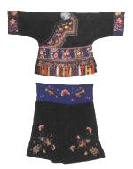 ,外套青色滿肩馬褂,腰系桃花兜,并配撤穗荷包,下著青色寬腳褲,腳穿白布襪子和天官云頭鞋。婦女頭上蒙白色繡花帕,兩耳垂環(huán),手戴鐲子或戒指,外套繡花圍裙,用繡花飄帶系著,右上胸佩掛三吊或五吊銀質(zhì)牙簽。下著蘭色寬褲,腳纏白色裹腳布,穿繡花尖尖鞋。無婚女性則挽“簪巴”,挽于腦后的稱“粑粑”,挽于頭頂?shù)姆Q高把簪,簪上套有網(wǎng),橫插簪子;兒童衣服多繡花,外圍肚兜,頭戴虎頭鼓針菩薩帽,頸戴“項圈”、“百家鎖”等,手腕套有銀圈,上系小吊,吊上有錘、鈴、鞋、斧、簽等。