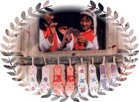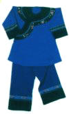 邊。男捆腰帶,女套繡花圍裙。頭上均包青布帕或絲帕,男帕左方垂一節(jié)過耳,婦女全包頭。未婚閨女留長發(fā)扎辮,用紅頭繩扎上下兩端,額前前留“劉海”。已婚婦女挽上發(fā)管,別簪,插銀首飾。褲子多為青、藍色、上結(jié)白布褲腰,褲腳短且大。青壯年男子打綁腿,女褲以對襯色布加邊,上綴三條均等的梅花條,腳上穿青布瓦鞋,包白色裹腳布。若遇喜慶節(jié)日或走親訪友,則另有一番梳妝打扮,如加佩牙簽、銀牌等。