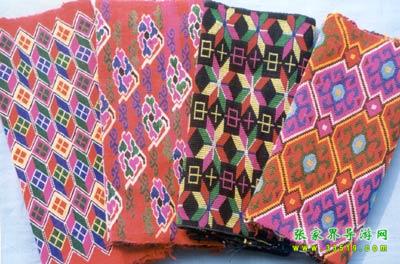 ![]() 織錦。又名“西蘭卡普”、“土花鋪蓋”,為土家族傳統(tǒng)工藝品之一,是森林公園工藝品廠的主要產(chǎn)品??楀\是在特制的本質(zhì)織機(jī)上以錦紗為經(jīng)、五彩絲線為緯、手工提花織成。以其質(zhì)地厚實(shí)、堅(jiān)韌,色彩鮮艷,格調(diào)古樸,流暢生動(dòng)著稱(chēng)。圖案有花草、鳥(niǎo)獸、生產(chǎn)、生活、幾何、字樣等種類(lèi)。為舊時(shí)土家姑娘必備嫁妝之一。據(jù)考證,早在漢代,土家織錦就作為方物貢入漢室宮廷。20世紀(jì)后,土家織錦曾漂洋過(guò)海至日、美、英等國(guó)展出,并作為禮品,被國(guó)家領(lǐng)導(dǎo)人贈(zèng)送給外國(guó)元首及政府官員,如今織錦以壁掛、枕巾、沙發(fā)墊、桌圍、提袋、服飾等多種式樣遠(yuǎn)銷(xiāo)世界各地。