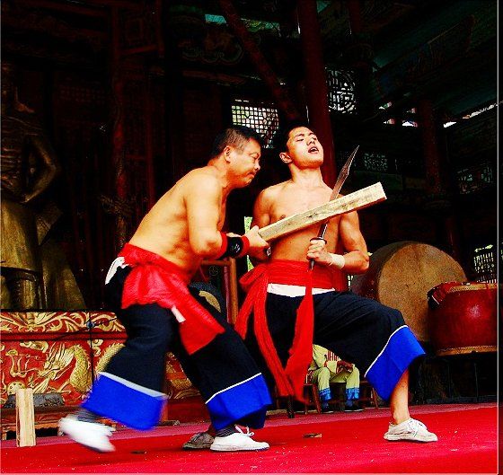 大庸氣功 大庸氣,堪稱武林奇葩,曾為祖國贏得聲譽,海內(nèi)外享有極主名望。 大庸氣功是大庸各民族特別是土家族傳統(tǒng)體育項 目之了,分健體氣派、武術(shù)氣功兩類。前者有“返還 功”、“馬王推氣功”、“少林達摩醫(yī)療保健氣功” 等;后者有靜坐、壁虎、靈子、二指彈、碎石、松靜 、硬氣、五禽、五陽功等,尤以硬氣功著稱。大庸硬 氣功,歷史悠久,漢代相單程,明代覃后,清代劉明 燈,當代湯子模、周鐵鞭、杜心武、趙繼書等都具有 超人硬氣武功。大庸土著民族在漫長的反征服、反壓 迫斗爭,博采武當、少林南北派、昆侖派眾家武林精 華,創(chuàng)造出獨此一家的大庸硬氣功。 據(jù)傳,大庸硬氣功鼻祖是楚國鬼谷子?!?a class="insidelink" href="http://www.pufenprinting.com/cityinfo/15580531721.html" title="永定區(qū)">永定縣 志》有關(guān)鬼谷子隱居天門山鬼谷洞潛心學(xué)《易》、傳 授方術(shù)的記載。到清代有武林高手朱茂嶺,隱居三岔 村北芭蕉灣洞,研究鬼谷氣功之術(shù),后收西溪坪胡口 子、余世萬(即“余通人”)為徙,傳其衣缽。余通 人將武術(shù)氣功系統(tǒng)整理,發(fā)揚光大,播名于世。 新中國成立后,黨和政府十分重視民間氣功發(fā)掘 整理,并正式列為體育項目加以普及發(fā)展,今日大庸 市習(xí)練硬氣功達數(shù)萬人眾。永定區(qū)官黎坪村世有“硬 氣功之鄉(xiāng)”盛譽,該村男女老幼,練功已蔚成風(fēng)氣, 其武師趙繼書,1979年先后參加全省和全國武術(shù)大賽 ,均獲一等獎,受到國家體委重視,同年7 月趙繼書 專程到北京給中央領(lǐng)導(dǎo)同志匯報表演。嗣后,隨同中 國武術(shù)代表團和國家領(lǐng)導(dǎo)人先后兩次出國,到盧森堡 、意大利、比利時、羅馬尼亞、馬其他和東南亞等國 家訪問。他表演的臥刀碎石、頭頂開石、雙鳳灌耳、 頭碰石柱、叉尖推磨等精彩節(jié)目,博得外國友人好評 。盧森堡一位榮獲國家獎牌的武士,看了表演后連夜 來到中國大使館,將自己珍藏多年的獎牌贈送給他; 盧森堡國王主動熱情走上臺與趙繼書熱情擁抱,連連 稱贊:“了不起!了不起!國際氣功大師!”并把珍 藏紀念章一枚贈送給趙繼書。一位法國朋友十分贊賞 說:“中國的氣功,稱為全人類的寶貴財富,是有科 學(xué)道理的。”自此,大庸硬氣功譽滿全球。湖南瀟湘 電影制片廠專門拍攝了彩色紀錄片《大庸氣功》。 大庸硬氣功共有二十多個項目,最有影響的是: 腹臥鋼叉 由二人在地面扶住一根叉尖朝上的三 股鋼叉,叉尖猁鋒利,然后一個俯身叉尖,尖抵腹部 ,待其四肢平展懸空,扶叉二人轉(zhuǎn)動鋼叉,謂之推磨 。表演時,要求臥叉者運氣于腹,氣意集中,稍有大 意,叉即穿腹而過。 臥刀破石 先固定兩把大刀,刀口朝上,臥刀者 運氣后,由其他人抬臥于刀口上(有仰臥、俯臥兩種) ,然后在臥刀者腹部或背部置一碩大石條(約數(shù)百斤) ,一人或兩人輪大鐵錘狠擊石條直至斷裂破碎為止。 釘?shù)洞财剖?地上倒一層碎玻璃片,一人仰臥其 上;然后腹上置釘床,又一人仰臥釘床上,再于第二 人腹上置釘床,第三人仰臥刀床上,腹部上壓一塊數(shù) 百斤大條石,由人掄錘狠砸,至石破為止。 銀槍刺喉 用一根兩頭安有鋒利槍頭的鋼槍,抵 置兩位表演者喉部,然后相對發(fā)力,至槍桿抵成彎弓 形而喉部安然無恙。 徙手斷石 表演者將堅滑如鐵一塊卵石置于石凳 (地)上,然后運氣于掌或指擊斷(碎)卵石。 踢腿斬石 表演者運氣于腿,以腿踢斷石條。一 般可踢斷15公分以上厚度的麻石條或青石條。 胸部打刀 將鋒利大刀刃口置于胸部肌肉上,用 一根拳頭粗木棒猛擊刀背,至棒斷而胸部無傷。 新中國成立以來,大庸民間武術(shù)與民族體育逐漸 融為一體,發(fā)揮著提高人民身體素質(zhì)、弘揚中華武術(shù) 傳統(tǒng)和增進國際友誼重大作用。除硬氣功外,還有數(shù) 十種武術(shù)形式散見于民間武術(shù)體育活動之中。如打飛 棒、扭扁擔(dān)、抵搭斗杠、擠油渣、甩抱腰、舉石鎖、 板牛角(一種斗牛形式)等等。其特點是因地制宜, 不分場地,凡田園地角院壩集鎮(zhèn),都是習(xí)武練功、開 展活動的處所,頗具泥土氣息。擬或以生活中某些動 作和動物的某種形態(tài),稍加模仿演繹,便成某一獨特 武術(shù)形式。如天門武術(shù)功夫大師余道人所創(chuàng)造的“宮 天梳”、“巖燕樸天門”等;也有就地理特點創(chuàng)造某 種武功形式的,如“蕩藤”等。 以上部分圖片均來自互聯(lián)網(wǎng),出處不詳,請作者與本站聯(lián)系。 |