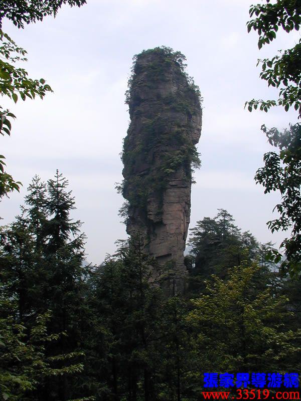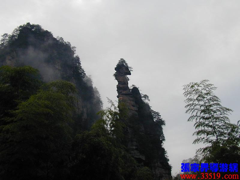 (南天一柱)現(xiàn)在我們前方幽谷峰林中有一高達200多米的孤峰,宛如擎天玉柱。上部灌木點綴,中部巖身赤裸,下部樹木遮掩,峰體渾圓、偉岸,因立南天門下而得名。