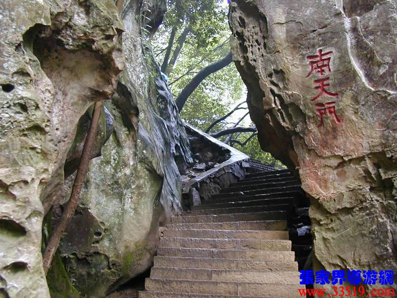 (南天門)(前行20米)現(xiàn)請大家抑頭望,可見一洞門,此門高約30米、寬4米左右,由游道兩側(cè)的兩座石峰斜傾拱峙而成。門右邊不遠處一峰高約20米,峰頂如人頭,有臉有面,似把門將軍。