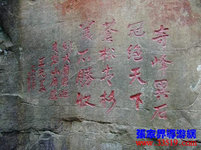 (王光美詩刻)1983年11月30日,前國家主席劉少奇夫人王光美在省人大副主任羅秋月等人陪同下,登上了張家界,她是最早訪問張家界的上層名流。想當(dāng)年,這里還是一條人工剛剛挖出來的小毛路,王光美被一路風(fēng)光所震撼,也不免勾起了許多關(guān)于劉少奇的往事。這四句詩并不是一氣呵成的,前后到了四處景點,才吟出這四句詩來:奇峰異石,冠絕天下,蒼松青杉,美不勝收。