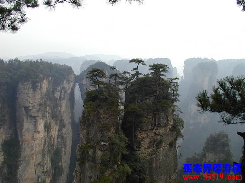 (天下第一橋)更多天下第一橋圖片>>>> 那就是“天下第一橋”。你們看,兩座山峰被一條長廊連在一起,形成天然橋洞,平時(shí)吞云吐霧,氣勢(shì)壯觀雄奇。橋面寬約兩米,長20余米,絕對(duì)高度357米。橋上蒼松挺拔,橋邊古藤垂掛,橋下深不可測(cè)。走在橋上,只見霧氣蒸騰,松濤呼嘯,石橋好像也顫顫悠悠,晃晃搖搖似的,令人驚心動(dòng)魄。這里是張家界風(fēng)景一絕,是大自然的一個(gè)奇跡。