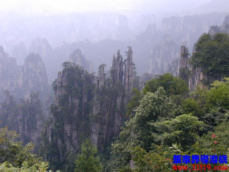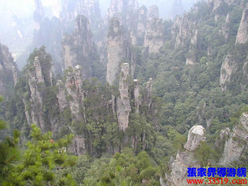 (大觀臺(tái))這就是大觀臺(tái)。極目遠(yuǎn)眺,千百座奇峰盡收眼底。一位詩人說,武陵源的砂巖峰林是一步一觀景,千步千造型,一山有四季,十步不同天。專家測(cè)算出武陵源石峰有3103座。一如一位高超的雕塑大師,模擬宇宙萬物,無不形狀逼真,維妙維肖,栩栩如生,呼之欲動(dòng)。有的如海螺出水,有的如金龜銜日,有的如蓮花盛開,有的如天橋橫空,有的如長槍刺天,有的如寶塔聳立,有的如老人采藥,有的如玉女梳妝,有的如將軍出征,有的如戰(zhàn)馬長嘯,有的如情人幽會(huì),有的如夫妻相擁,有的如仙女散花,有的如村姑守望.....有的孤峰獨(dú)秀,有的直插云霄,有的婷婷玉立,有的威武勇猛,有的小巧玲瓏,有的大氣磅礴。進(jìn)入武陵源,但見一片峰的森林,峰的世界,峰的海洋。挺拔、奇秀、集中、原始、粗獷、古野。這就是武陵源。一位藝術(shù)大師說:武陵源的山峰,改寫了山的概念。大攝影家陳勃說:“三山五岳堪比美,華夏風(fēng)光每一流。”王繼杰先生說:“武陵源上三日游,勝讀千篇李杜詩。”許世杰先生說:“秀幽險(xiǎn)峻稱奇絕,五岳黃山拜下風(fēng)。”李成瑞先生為此大抱不平:“神州勝景誰為最?須請(qǐng)霞公重評(píng)勘。”可惜徐霞客無緣到大觀臺(tái)來,也不可能為武陵源作甚評(píng)價(jià)了。