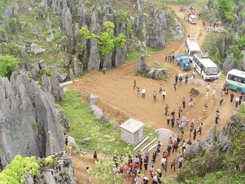 登上洛塔,只見(jiàn)連山綿谷,萬(wàn)石如林,一塊塊青灰色的大石頭競(jìng)高競(jìng)秀,競(jìng)美競(jìng)奇,綿亙縱橫,層疊交錯(cuò),造型奇特,塔狀、蓮臺(tái)狀、羅漢狀、錐狀、刀狀、箭簇狀、帷幕狀等林立薈萃,像一個(gè)個(gè)神奇的迷宮,組成洛塔地質(zhì)公園的旖旎景觀。有的玲瓏斫剔,若女繡工鐫;有的嶙峋怪異,如鬼斧神鑿;有的崢嶸巉峻,似水墨丹青;有的嵯峨兀立,藤蔓纏繞,更像一株株挺拔的古樹(shù)。高的、矮的、大的,細(xì)的。粗、瘦、皺、滑,各具特色,如人之面目相具而無(wú)一相似者,在綠樹(shù)紅花間亮麗起一道道迷人的風(fēng)景。洛塔石林遍及整個(gè)山界,較集中的有楠竹車水坪石林、梭洛趙家灣石林、八仙洞石林及公路沿線的銀河塔石林,僅車水坪一帶的石林面積就達(dá)1000多畝。無(wú)論其規(guī)模面積,造型及組合情況,洛塔石林都可與云南石林媲美。