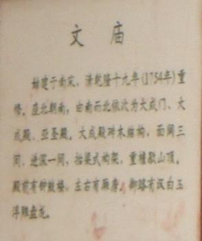 廟前面有學宮坪,亦名學坪,坪南端有大明壁。廟宇紅墻黃瓦,氣勢宏偉。正門曰奎星門,前院左右各植檜樹,常年翠綠,散發(fā)幽香??情T內有月形泮池,池周護以石欄。泮池附近有石坊三座,正南石坊匾額鐫有“斯文在茲”四字,東西兩坊貫通街衢。通過石坊便是大成門。進門左右是飛檐綠瓦的鐘鼓亭。大成門通向大成殿,有石鋪甬道直抵大殿臺基。臺高一米,全系石塊疊成。臺階分左右兩道,中有石雕盤龍,綴以云海波濤,栩栩如生,躍然石上。大成殿為歇山式重檐結構,周圍有16根圓石柱,內外枋、檁、藻井、斗拱、扇梧均五彩施繪,黃瓦飛檐,蔚為壯觀。殿后有亞圣殿,與大成門、奎星門前后襯應,更顯出大成殿主體的雄偉。