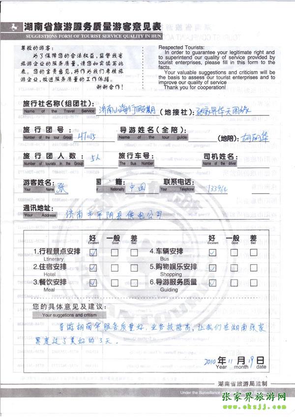 2010年11月15日張小姐一行5人評價導游優(yōu)