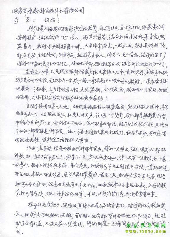 2009年5月19日“上?,F(xiàn)代攝影沙龍”一行16人,參加張家界旅游導(dǎo)游網(wǎng)組織的張家界旅游跟團(tuán),于2009年5月25日結(jié)束行程。游玩期間,由于導(dǎo)游楊蓓的出色講解和周到的服務(wù),得到客人的一致好評(píng)??腿颂丶谋?yè)P(yáng)信一封,如下: