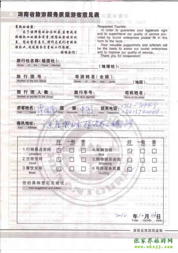 2010年10月12日廣東陳先生旅游質量反饋