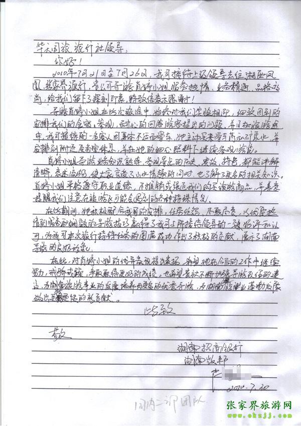 表揚信:湖南招商銀行對我社導游肖婷高度表揚