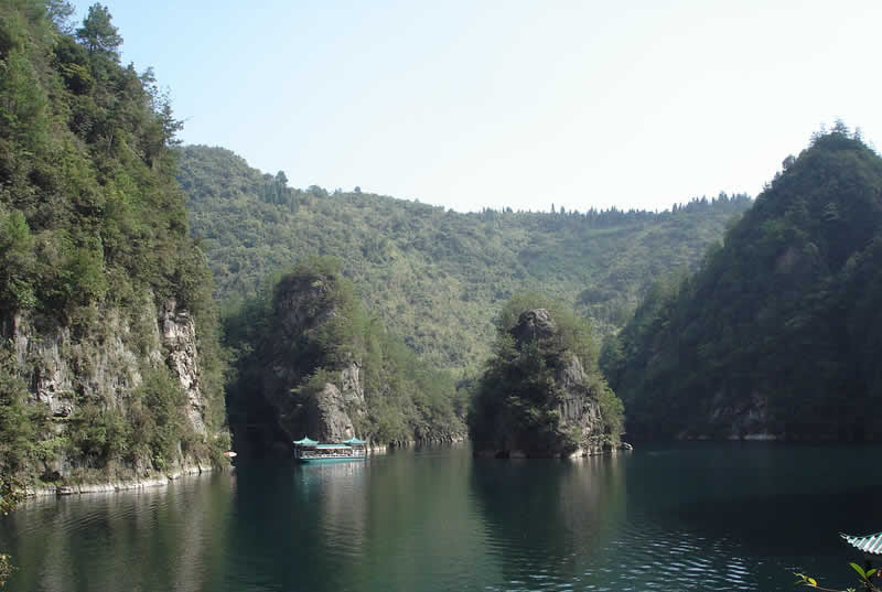 其位于武陵源區(qū)城南1.5公里處,是武陵源風(fēng)景名勝中的精品景點(diǎn)。它是一座罕見的高峽平湖,四面青山,一泓碧水,風(fēng)光旖旎,是山水風(fēng)景杰作。在此蕩舟,還可見到湖心島上“玉瓶開花”、“十女梳妝”、“金龜戲水”、“青蛙鬧春”等佳景。 寶峰湖是一個(gè)截流筑壩而成 的人工湖,深72米,長(zhǎng)2.5米公里, 以其秀麗的湖光 水色與幽野的洞天情趣成為武陵源水景風(fēng)光的代表之 作。湖中有兩座疊翠小島,近岸奇峰屹立,峰回水轉(zhuǎn)。